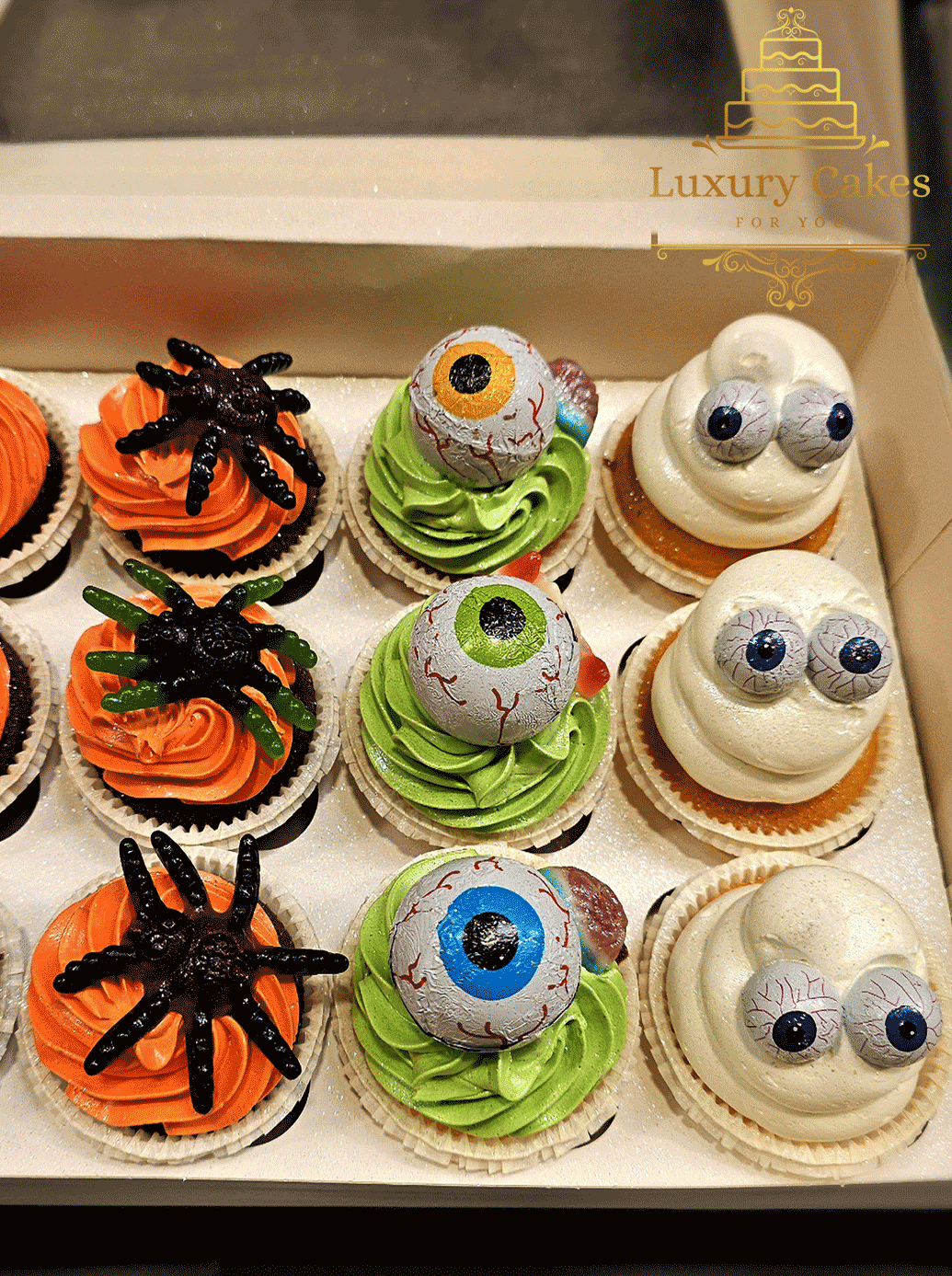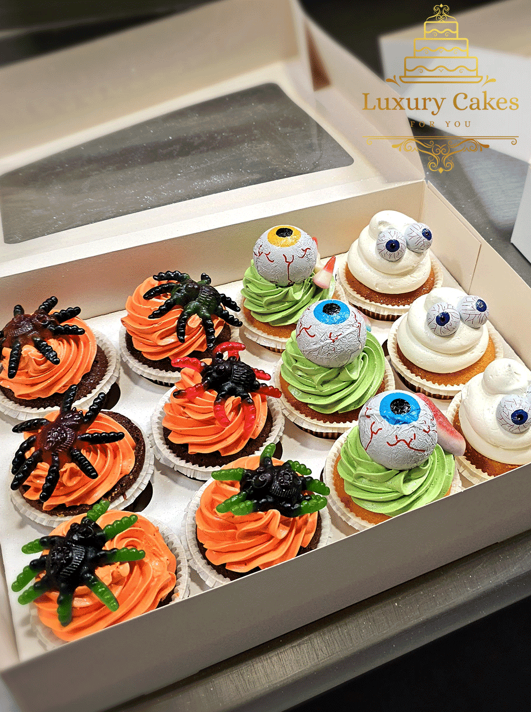 Halloween cupcakes, decor and cream colour may vary. If you have special request please contact us. 12 in the Box. Delivery free for minimum order £40.