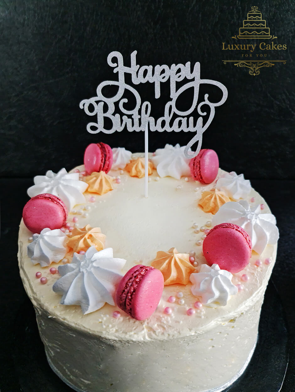 Colour of decorations and macaroons may vary, depend of availability. Whether you're after a rich chocolate cake, light sponge cake we know how make it perfect. Experienced Bakery with high quality and standards. All cakes are made fresh, also we can write a message from you on the cake or cake plate.